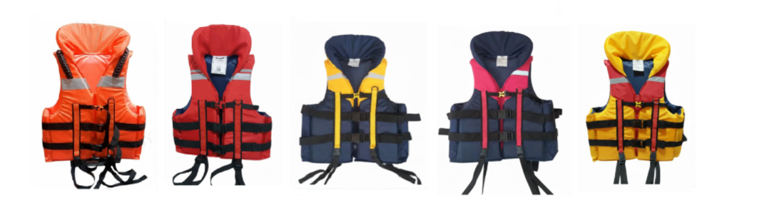 Chalecos salvavidas con cuellera, de material nylon reforzado con arnés para piernas e incluye silbato