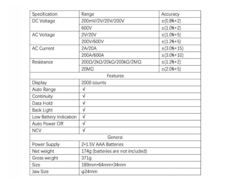 PINZA AMPERIMETRICA DIGITAL 600AMP AC/DC Ω, AUTO RANGO, NCV.